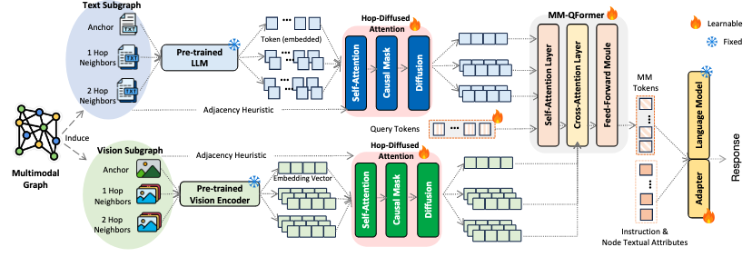 图3。Graph4Mm框架概述。跳扩散注意力通过因果掩蔽和跳扩散应用邻接启发式,而MM - QFormer在向LLM传递输入之前捕获细粒度的文本-图像交互。