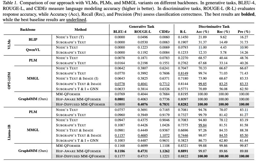 现实世界中的多模态数据通常展现出超越传统一对一映射(如图像-标题对)的复杂结构关系。跨模态实体以错综复杂的方式相互作用,图像和文本通过上下文依赖和共指关系形成多样化的相互连接。图为建模模态内和模态间关系提供了强大的结构信息。然而,先前的研究未能区分多跳邻居关系,并将图视为独立模态,这割裂了整体理解。该局限性给多模态学习带来两个关键挑战:(1)如何将多跳邻居的结构信息整合到基础模型中;(2)如何以系统化方式融合模态特定信息。为应对这些挑战,作者重新审视基础模型时代下图在多模态学习中的作用,提出Graph4MM——一个基于图的多模态学习框架。具体而言,引入跳数扩散注意力机制,通过因果掩码和跳数扩散将多跳结构信息整合到自注意力中。此外,设计了MM-QFormer(多映射查询变换器)用于跨模态融合。通过理论与实证分析,证明利用结构整合模态内与模态间交互的方法,相较于将图视为独立模态能带来更优越的多模态理解。在生成式与判别式任务上的实验表明,Graph4MM优于更大规模的视觉语言模型、大语言模型及多模态图基线模型,实现了平均6.93%的性能提升。