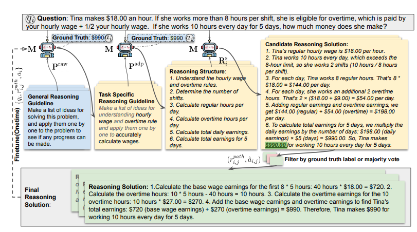 创新点与研究方法:提出ReGenesis框架,让LLM通过自我合成推理路径来提升推理能力,无需额外的人工或更强模型的监督。其核心创新在于从“抽象”到“具体”的路径生成流程:首先创建一组通用的任务无关推理指南,然后针对具体任务指令将其适配为任务特定的指南,再基于此生成抽象的推理结构,最后将其转化为详细的推理路径。通过使用真实答案过滤路径并作为提示,该方法在领域内和领域外任务上均显著优于STaR等基线,证明了其能有效增强LLM的推理泛化能力。