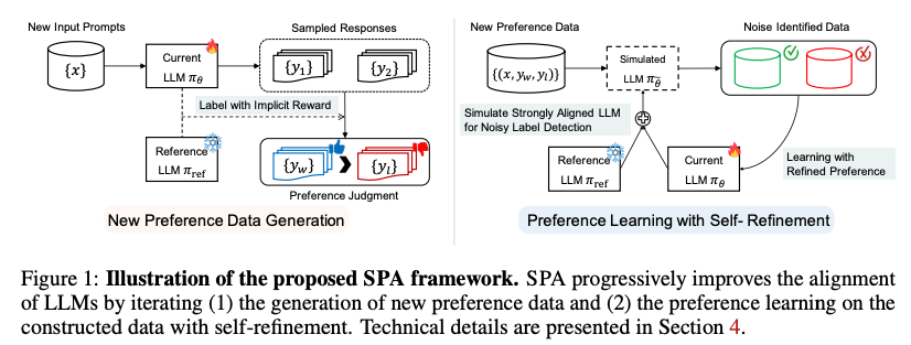 创新点与研究方法:本文提出了一种名为“扩散偏好标注”(SPA)的新框架,旨在用极少的人类标注偏好数据(如3.3%)高效对齐LLM。其核心创新在于利用LLM本身的逻辑(Logits)直接进行偏好判断,而非依赖外部奖励模型或上下文学习。SPA迭代执行两个步骤:1)使用当前模型生成新的偏好数据;2)通过包含去耦合噪声检测的自我精炼过程,利用这些自生成的数据训练模型。该方法在AlpacaEval 2.0等基准测试中显著超越了使用全量数据或现有基线方法(如LLM-as-Judge、PairRM)的模型。
