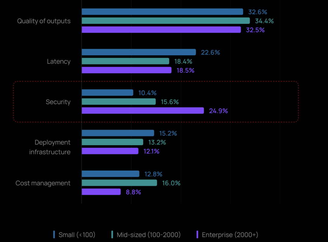 在员工规模 2000 人以上的企业中,质量仍是首要障碍,但安全已成为第二大关注点(24.9% 的受访者提及),超过了延迟,延迟更常被小型组织列为挑战。