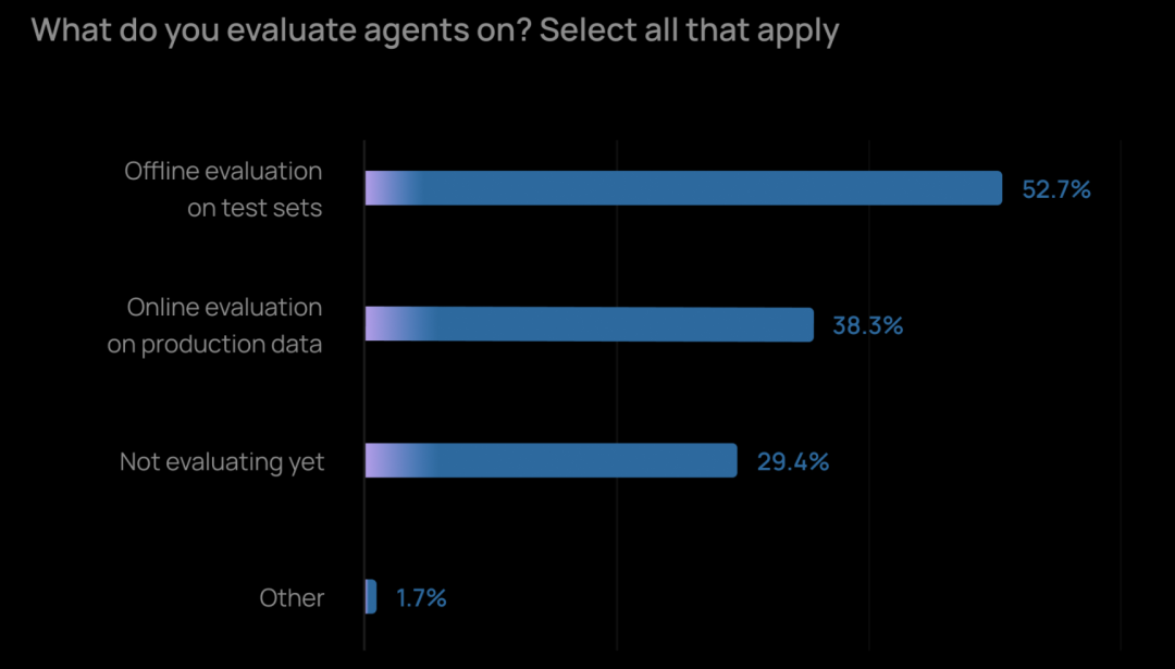 尽管可观测性的采用率更高,但智能体评估仍在追赶并逐渐获得更多关注。略超半数(52.4%)的组织表示会基于测试集进行离线评估,这表明许多团队已意识到在部署前排查回归问题、验证智能体行为的重要性。在线评估的采用率较低(37.3%),但随着各团队开始监控智能体在实际场景中的性能,其普及率正在逐步提升。