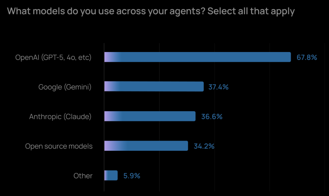 多模型并行成为常态:OpenAI 的 GPT 模型占据主导地位,但 Gemini、Claude 及开源模型的采用率也显著提升,微调尚未得到广泛应用。