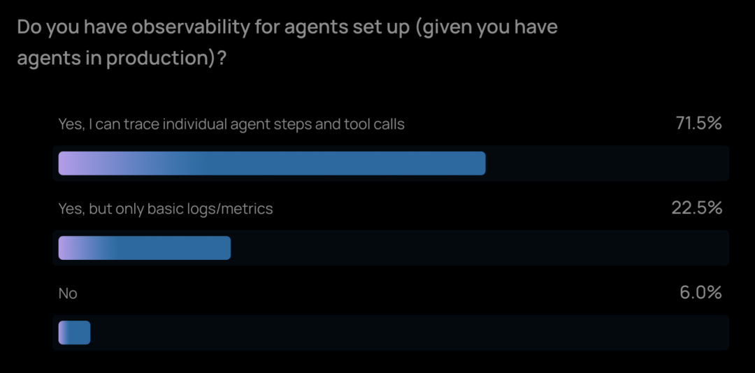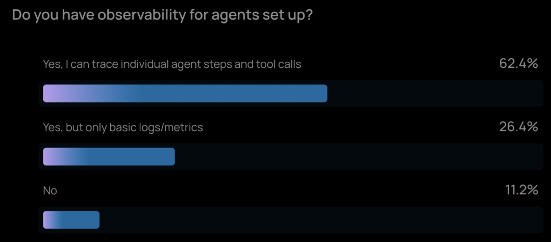 可观测性成为必备基础:近 89% 的受访者已为其智能体部署可观测性方案,普及率高于评估方案(52%)。