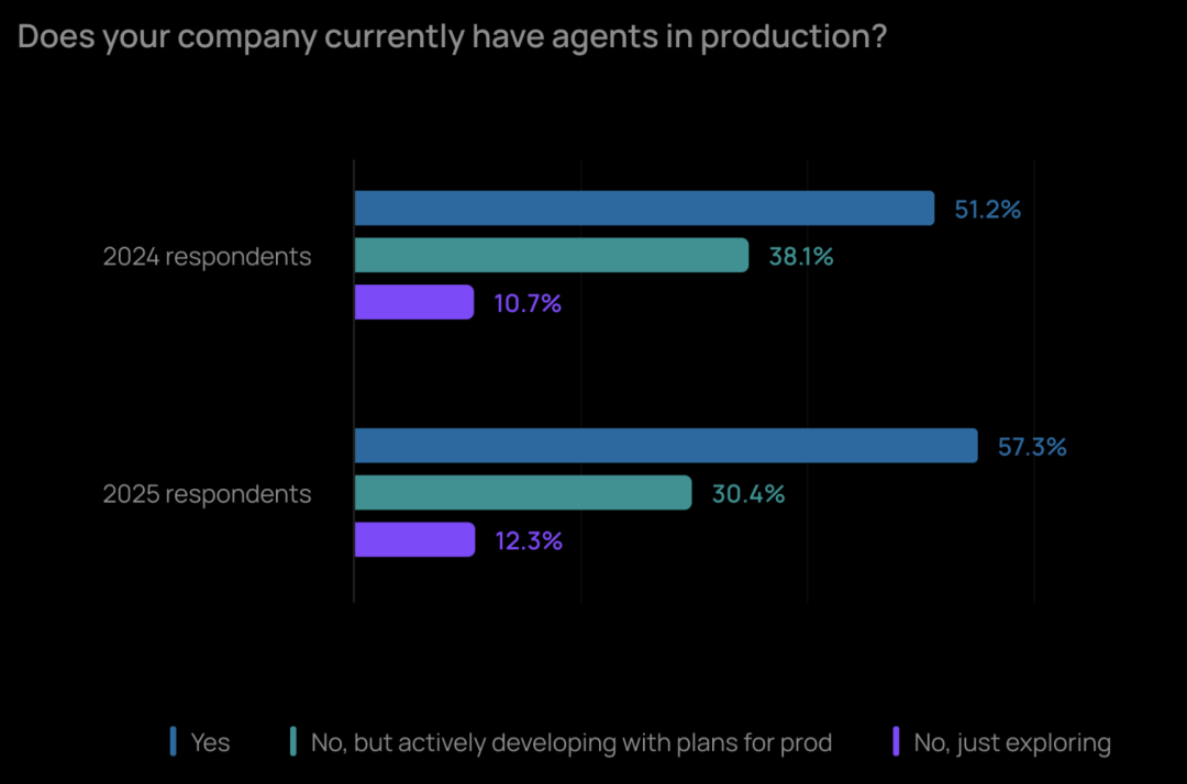 这与去年的调查结果相比有明显增长,去年仅有 51% 的受访者表示已将智能体投入生产。各组织正从概念验证阶段迈向规模化生产,如今大多数组织面临的问题已不再是 “是否要部署智能体”,而是 “如何部署” 以及 “何时部署”。
