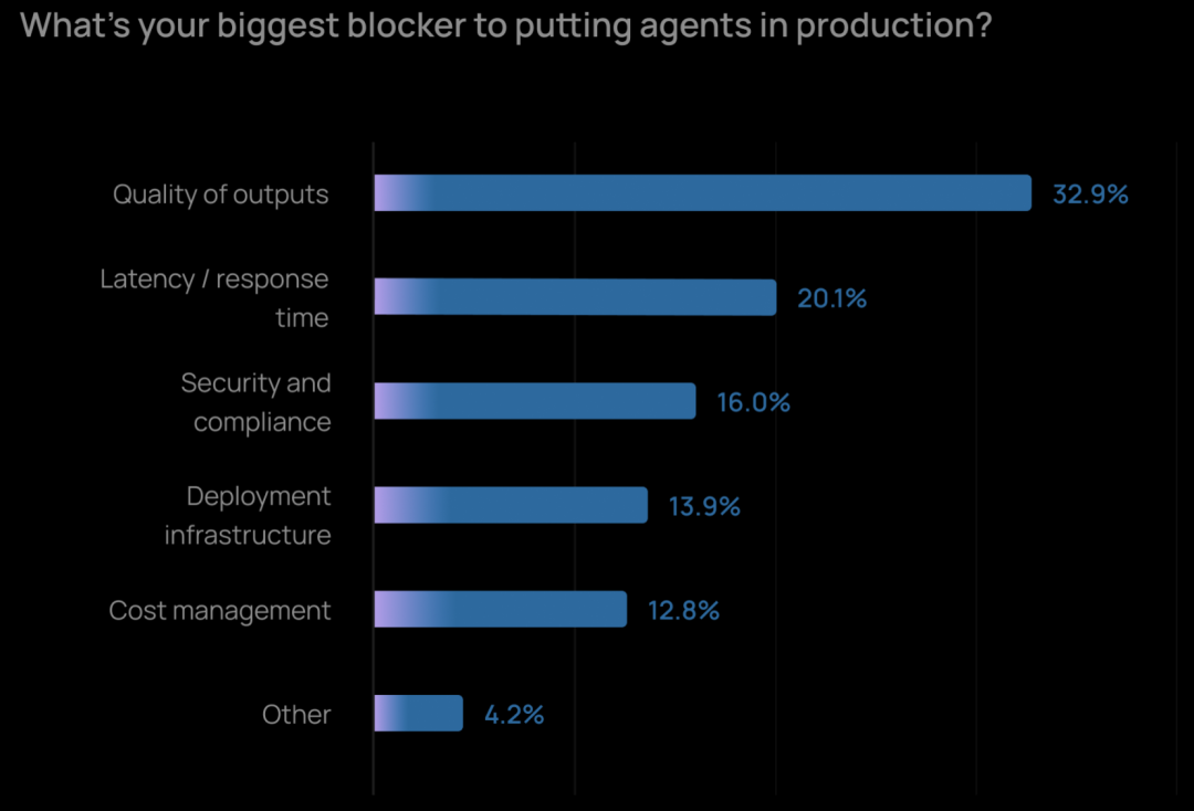 与去年的调查结果一致,质量仍是智能体落地生产的最大障碍。今年,三分之一的受访者将质量列为首要瓶颈,这包括输出的准确性、相关性、一致性,以及智能体维持适当语气、遵守品牌或政策准则的能力。