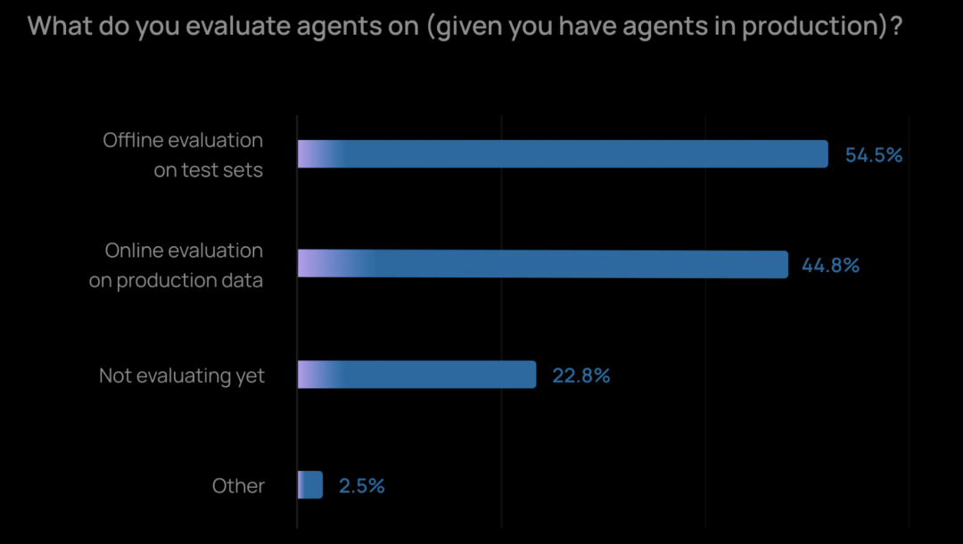 对于已将智能体投入生产的组织,评估实践可能更为成熟,整体评估采用率明显更高(“尚未进行评估” 的比例从 29.5% 降至 22.8%)。我们还发现,更多组织开始采用在线评估(44.8%),这表明一旦智能体面向真实用户,团队需要通过观测生产数据来实时发现问题。