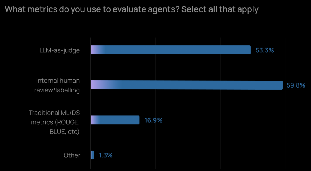 进行评估的组织还会结合人工评估和自动化评估方法:利用 “LLM 作为评判者”(LLM-as-a-Judge)实现广度评估,通过人工审核确保深度评估。更广泛地说,人工审核(59.8%)在复杂或高风险场景中仍不可或缺,而 “LLM 作为评判者” 的方法(53.3%)正越来越多地被用于规模化评估质量、事实准确性和准则遵守情况。相比之下,ROUGE、BLEU 等传统机器学习指标的采用率较低,这些指标可能不太适用于存在多种有效响应的开放式智能体交互场景。
