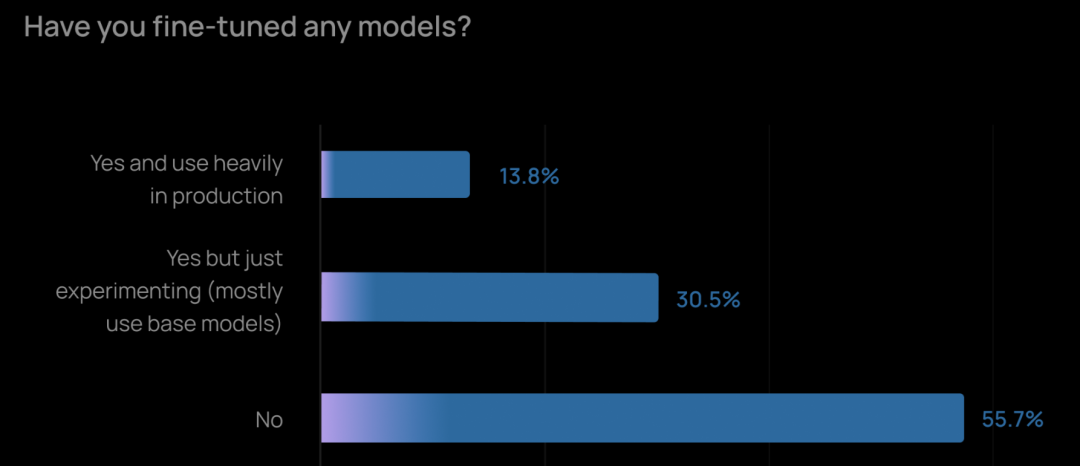 与此同时,微调仍是专业化操作,尚未成为标准流程。大多数组织(55.7%)未进行模型微调,而是依赖基础模型,结合提示工程(Prompt Engineering)和检索增强生成(RAG)技术。由于微调需要在数据收集、标注、训练基础设施及持续维护方面投入大量资源,因此它通常仅用于影响重大或高度专业化的应用场景。