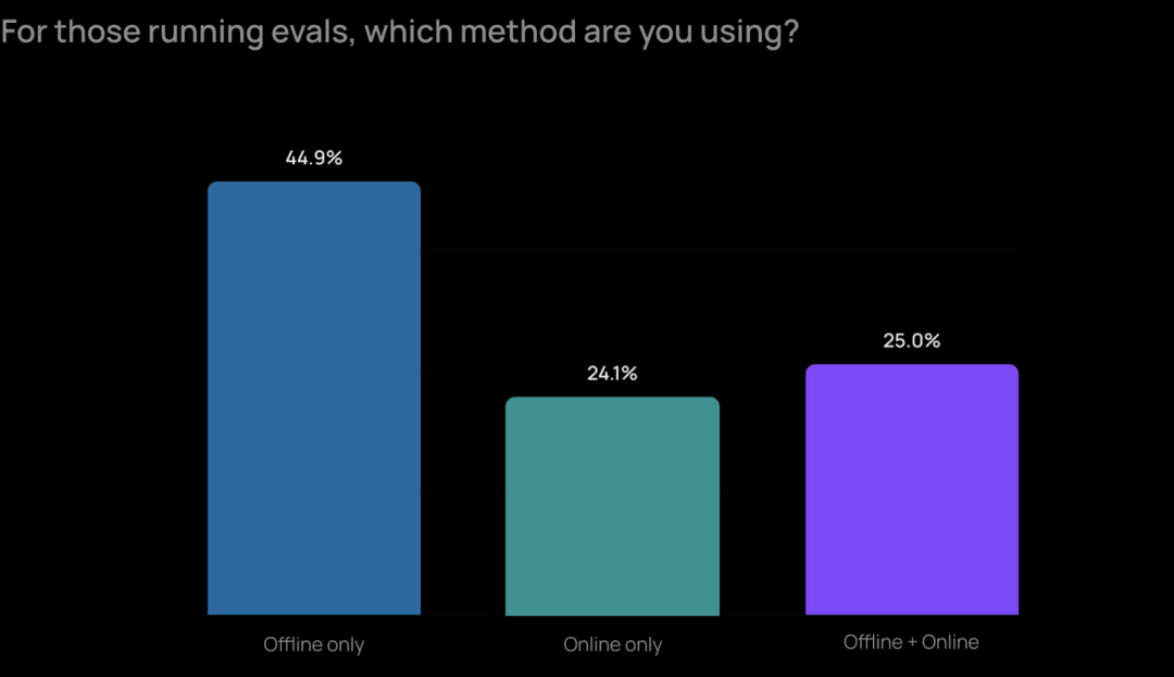 大多数团队仍从离线评估入手,这可能是因为离线评估的入门门槛更低、设置更简单,但许多团队正逐步采用混合评估方法。在进行评估的组织中,近四分之一同时结合了离线评估和在线评估。