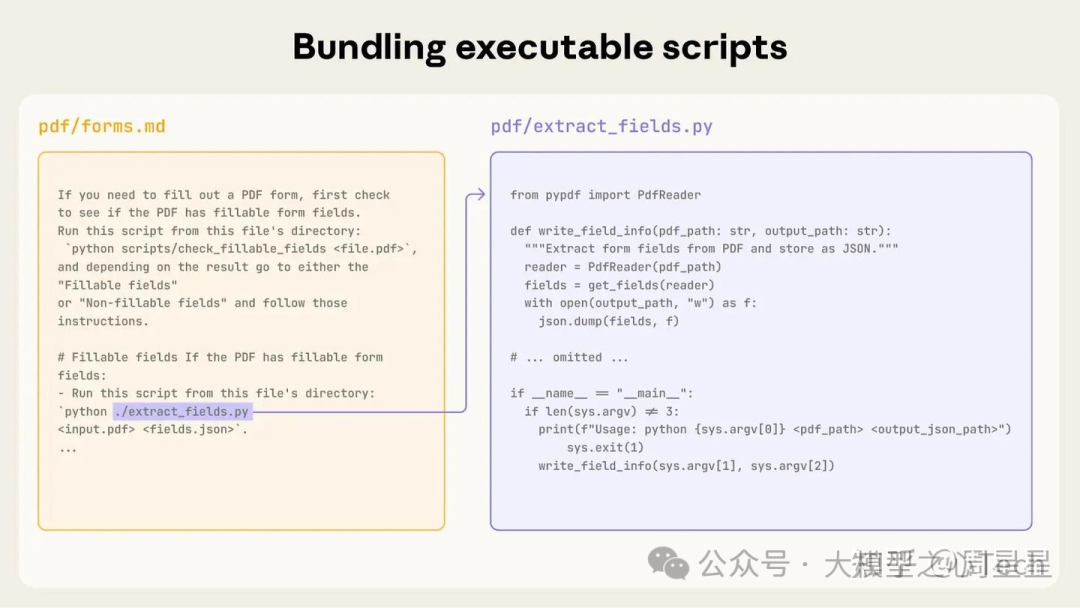 官网示例中,PDF 技能包含一个预先编写的 Python 脚本,该脚本可以读取 PDF 并提取所有表单字段。Claude 可以运行此脚本,而无需将脚本或 PDF 加载到上下文环境中。而且由于代码具有确定性,因此这个工作流程是一致且可重复的。