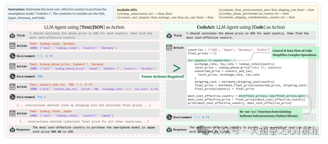 - 解决方案: 不再进行 3 次 LLM 往返交互 (Roundtrips),而是直接提供 Python 库,让 Agent 编写一段动态脚本一次性执行所有步骤。如下图,假如用 tool,可能一个简单的问题“帮我查看每个国家换算成美元后的手机价格,找过最便宜的国家”需要上百次的 tool 调用,但用代码其实只是十几行代码的循环。