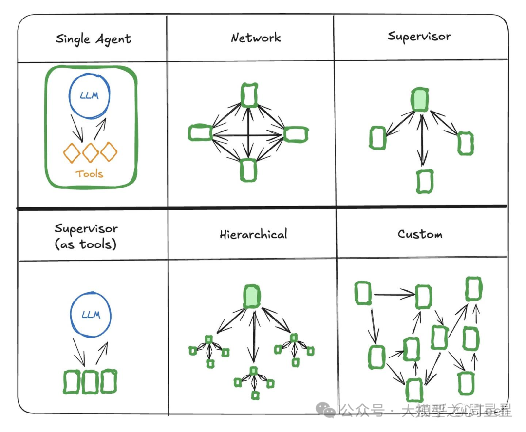 但 Sub-Agents 的架构已经收敛到一个超强的 main-agent,必要时再按需调用 sub agent 的架构。例如下图的 supervisor。这种架构还有个好处,KV cache 能很好地利用上,省钱+跑得快。