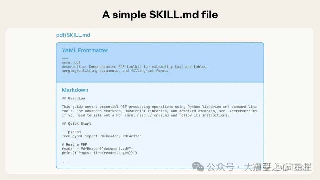 例子:Claude 对理解 PDF 已经很强了,但在直接操作它们(例如填写表格)的能力上受到限制。因此,Claude 抽象出一个 pdf 的 skill。