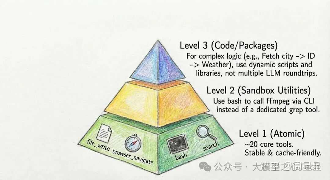 向 LLM 一次性灌输超过 100 个工具会导致 上下文混淆 (Context Confusion) ,极易引发幻觉或参数错误。Manus 等先进架构通过三层分层设计缓解了这一问题: