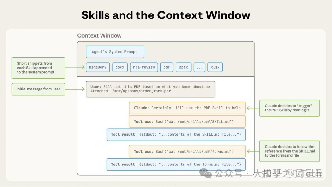 - 开始时,上下文窗口包含核心系统提示和所有已安装技能的元数据,以及用户的初始消息;