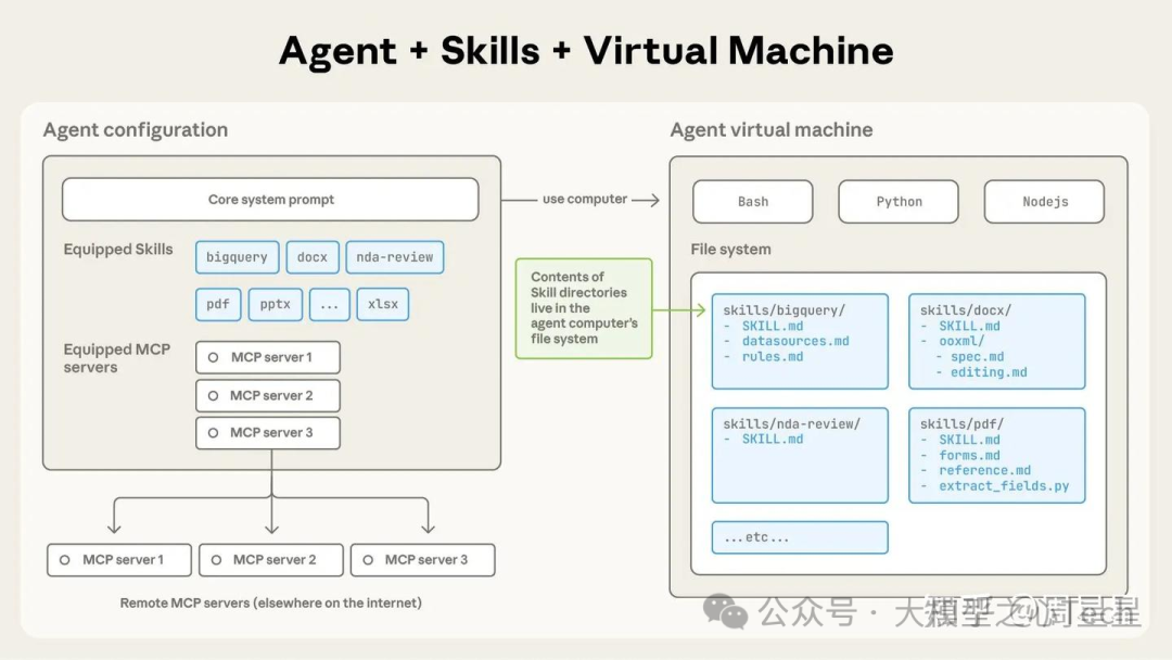 - 业务知识技能化 (Skills via File System) : 将业务文档、SOP(标准作业程序)抽象为 Skills,存储在 Agent 的文件系统中。模型根据任务需求,按需动态加载(Load on Demand),而非一次性塞入。