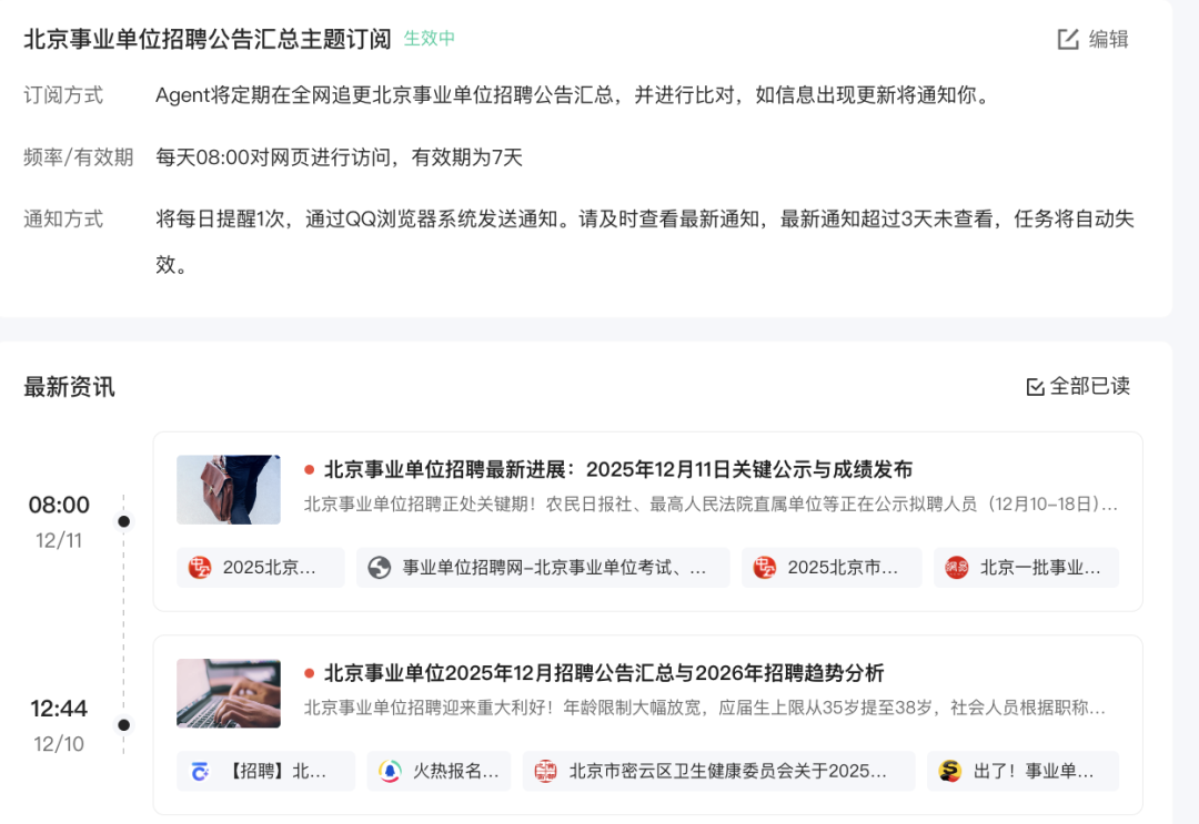 这回我给AI的任务是让它帮我追踪北京事业单位招聘信息的最新信息,输入指令后它立刻开始搜索,不到1分钟就整理出来一份订阅报告,比手动找快太多: