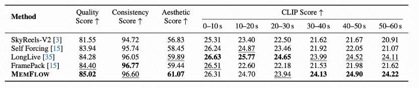 通过逐段评估视频与文本匹配度的CLIP分数,可以观察到一个关键现象:在视频的后半段*(如40-60秒)*,许多模型在语义一致性上的表现会因误差累积而出现明显下滑,但MemFlow的分数能够持续保持在较高水平。这反映了其动态记忆机制在维持长期叙事一致性方面的有效性,有助于缓解“越往后越乱”的问题。