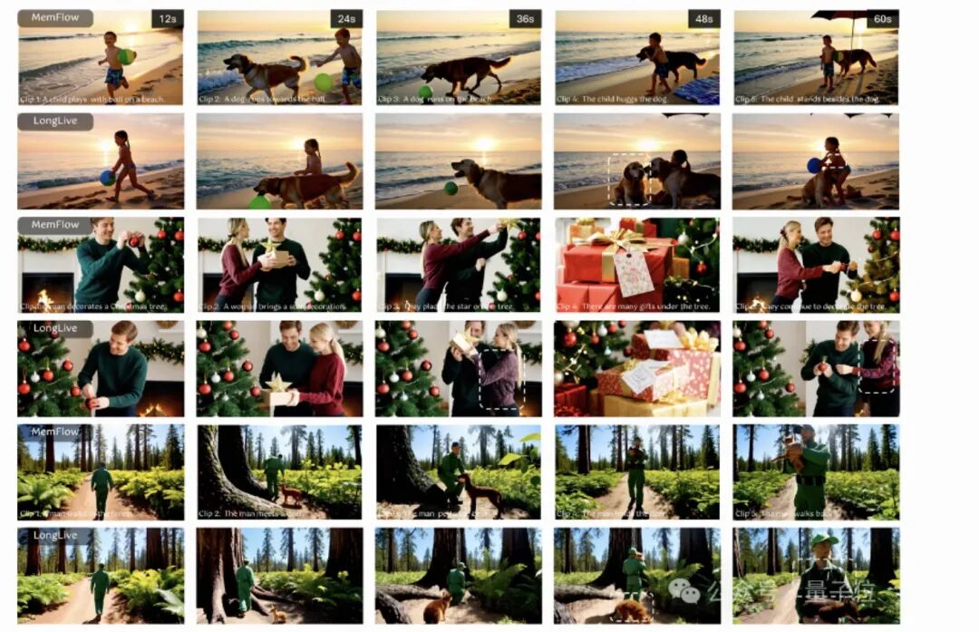 精准的角色追踪与再现:以上对比图有效地展示了MemFlow在处理角色互动时的稳定性。无论是沙滩上玩耍的孩子与小狗,还是家庭装饰圣诞树的场景,MemFlow都能确保故事中的核心角色在多段视频中保持一致。相比之下,基线模型LongLive在切换提示词后引入了多余或不一致的新角色,造成了叙事不连贯;其他模型则存在更加严重的质量漂移和主体遗忘。
