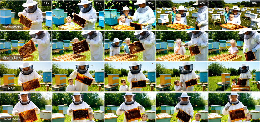 1. “只记开头”的策略:一些模型只保留第一个视频片段作为记忆,后续所有生成都参考它。这种方法在单一场景下尚可,一旦故事发展,需要引入新角色或切换到全新场景时,模型就会因为“记忆”中没有这些新信息而迷失,导致后续生成与此前内容在视觉和语义上均存在不连贯性。