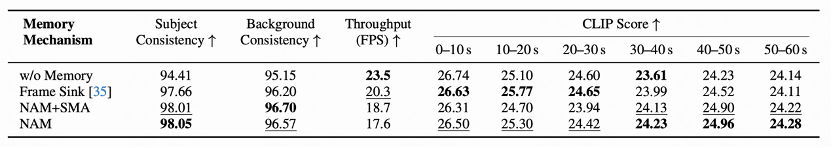 此外,在针对不同记忆机制的消融实验中,结果显示,MemFlow所采用的“叙事自适应记忆+稀疏激活*(NAM+SMA)”策略,相较于“无记忆”或仅“记住第一段(Frame Sink)*”的方案,在主体一致性和背景一致性上均取得了提升,同时还实现了比采用完整记忆库更高的运行效率。