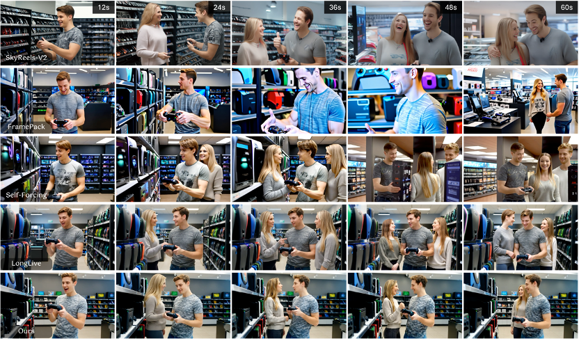 在交互式创作中,仅仅切换一句提示词,故事就可能瞬间“崩塌”:一个角色暂时离开画面后再次出现,却“面目全非”,仿佛换了演员;或者,当你尝试引入一个新角色,AI却在后续的剧情中反复“召唤”这个新人,甚至将多个角色的特征混淆在一起。这种“金鱼记忆”式的顽疾,正是长视频生成在叙事上的一大致命伤。