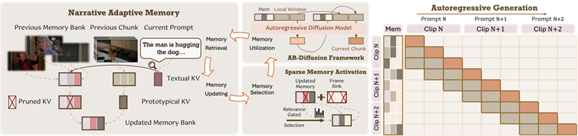 叙事自适应记忆*(NAM)*:在生成新片段前,它会根据当前提示词,智能地从记忆库中检索出最相关的视觉记忆。这使其无论是延续旧角色还是描绘新互动,总能找到准确的视觉参考,从而维持一致性。这种设计使模型能够在有限的记忆容量下优先保留与当前叙事最相关的信息,从而在一致性和计算开销之间取得平衡。