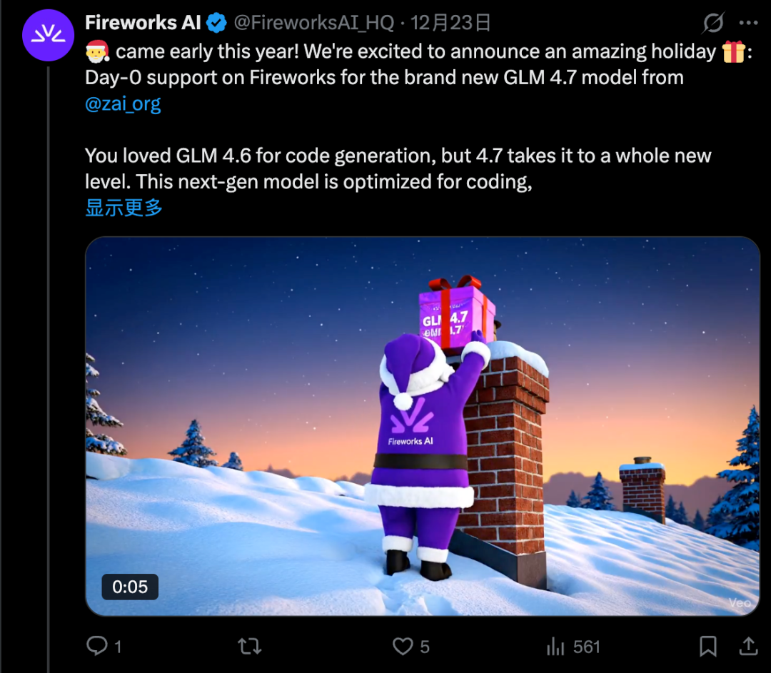 包括估值40亿美元的Fireworks也在Day0支持GLM 4.7,嗯,美国人也是有更好的模型选择了。