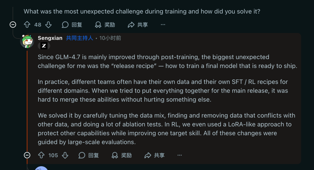 智谱团队在AMA中明确表示,GLM-4.7的改进主要集中在后训练阶段。