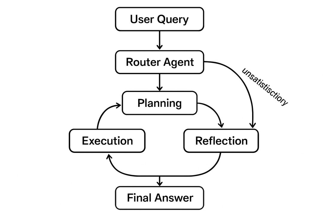 反思智能体对执行智能体返回的中间结果进行质量检查。它会根据预设的评估标准(如完整性、准确性、逻辑一致性)进行批判性审查。如果评估失败,它会向规划智能体提供反馈,触发新一轮的规划和执行,形成一个闭环迭代。