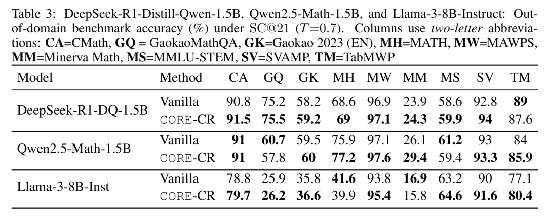 进一步的实验证实,CORE的益处并不局限于单一模型。表3显示CORE是模型无关的,为不同的模型(如DeepSeek-R1-Distill-Qwen-1.5B、Qwen2.5-Math-1.5B和Llama-3-8B-Instruct)在基础版和指令调优版设置下均带来了一致的改进。