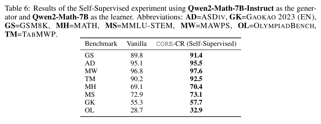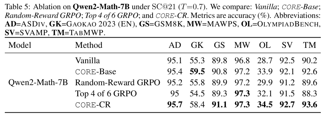 关键的是,消融研究验证了这些提升归因于CORE的独特机制。表5显示,仅使用随机奖励或在GRPO中增加候选解决方案的数量并不能复现这些改进。此外,一项在表6中详述的“自监督”实验(整个流程被限制在单一模型家族内)证明,CORE的有效性并不依赖于从优越教师模型进行知识蒸馏。 驱动学习的是概念引导干预的内在逻辑,而非外部专业知识。