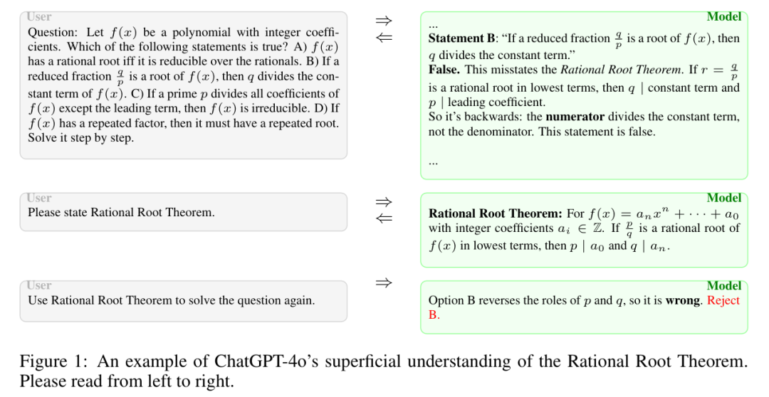 一个LLM或许能够完美地复述数学定理,如有理根定理,但在正确应用该定理解决问题时却会失败,尤其是当问题的表述方式稍有不寻常时。如研究中的图1所示,一个最先进的模型可以正确陈述该定理,但在将其应用于一道分子和分母角色被互换的多选题时,仍然会出错。这表明模型的解题过程往往固守于僵化的、基于启发式的模式,而非由对底层概念的灵活理解所引导。
