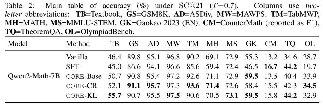 如表2所示,使用CORE变体训练的Qwen2-Math-7B模型相较于原始基线取得了显著提升。在内域的Textbook测试集上,使用CORE-KL时,准确率从46.4%跃升至55.7%。更令人印象深刻的是,这些提升具有泛化性。在明确测试定理应用的THEOREMQA基准上,准确率从34.6%上升至44.2%。在GSM8K、MATH和其他具有挑战性的数据集上也观察到了类似的改进。