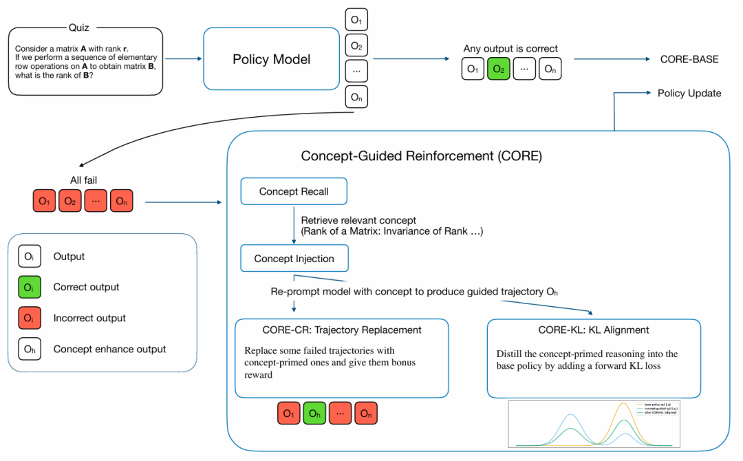CORE-KL(概念引导的KL正则化):此方法提供一种更隐式的、细粒度的信号。同样在失败时触发,它鼓励模型的标准推理过程与其更稳健的、概念启动的过程对齐。这是通过向RL目标添加一个前向KL散度损失项来实现的: