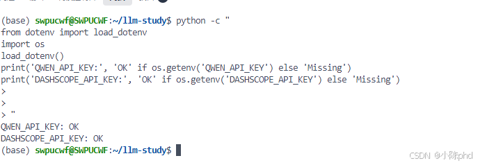 测试是否能正确加载环境变量python -c “from dotenv import load_dotenvimport osload_dotenv()print(‘QWEN_API_KEY:’, ‘OK’ if os.getenv(‘QWEN_API_KEY’) else ‘Missing’)print(‘DASHSCOPE_API_KEY:’, ‘OK’ if os.getenv(‘DASHSCOPE_API_KEY’) else ‘Missing’)”