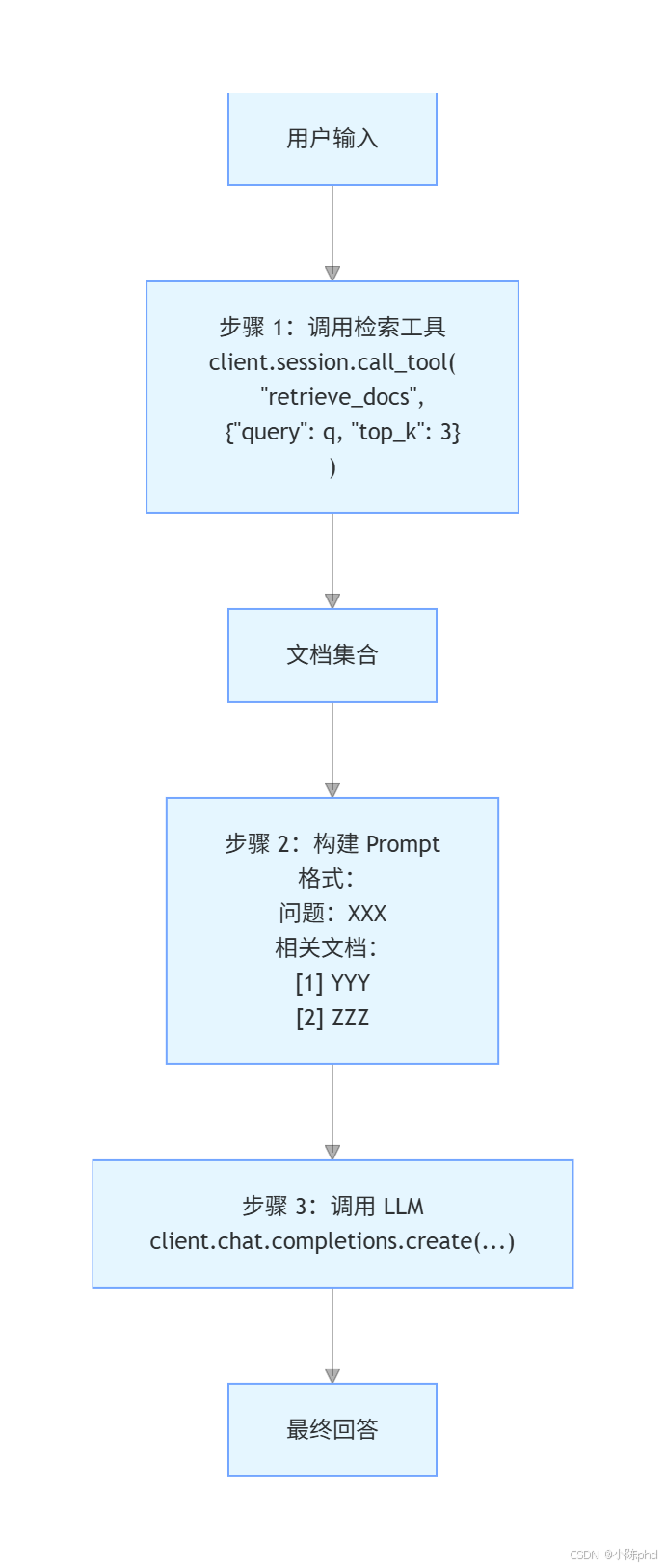 Client 端: 1. 解析用户输入 2. 调用 session.call_tool("retrieve_docs", {...}) 3. 等待响应MCP 通信: { "jsonrpc": "2.0", "id": 1, "method": "tools/call", "params": { "name": "retrieve_docs", "arguments": { "query": "糖尿病", "top_k": 3 } } }Server 端: 1. 接收工具调用请求 2. 验证参数 3. 执行 retrieve_docs 函数 4. 返回结果MCP 响应: { "jsonrpc": "2.0", "id": 1, "result": { "content": [{ "type": "text", "text": "[0] 糖尿病是一种慢性代谢性疾病..." }] } }