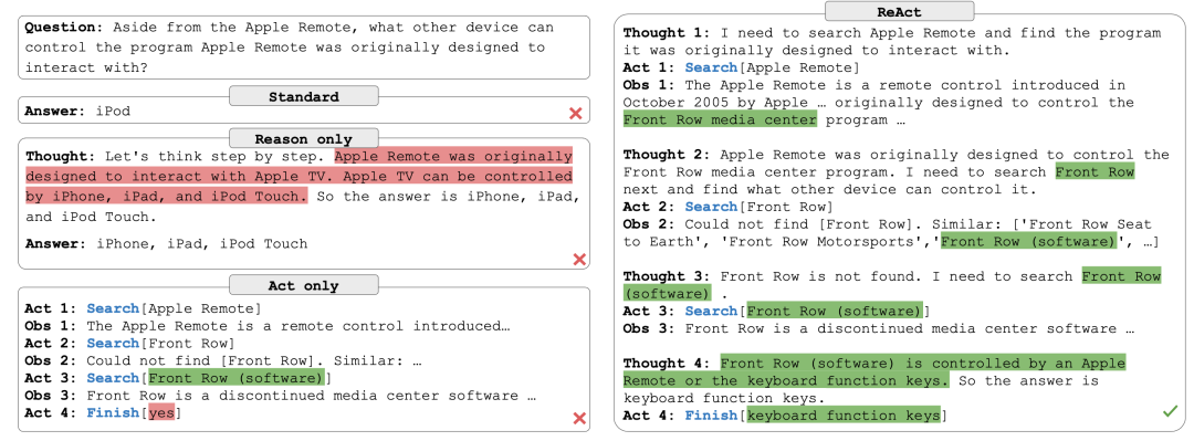 - • 纯行动(act only):例如让模型输出行为/动作,与外界环境或 API 交互(比如查询知识库或执行步进任务)。这类方法能获取外部信息,但缺乏高层推理和规划能力。