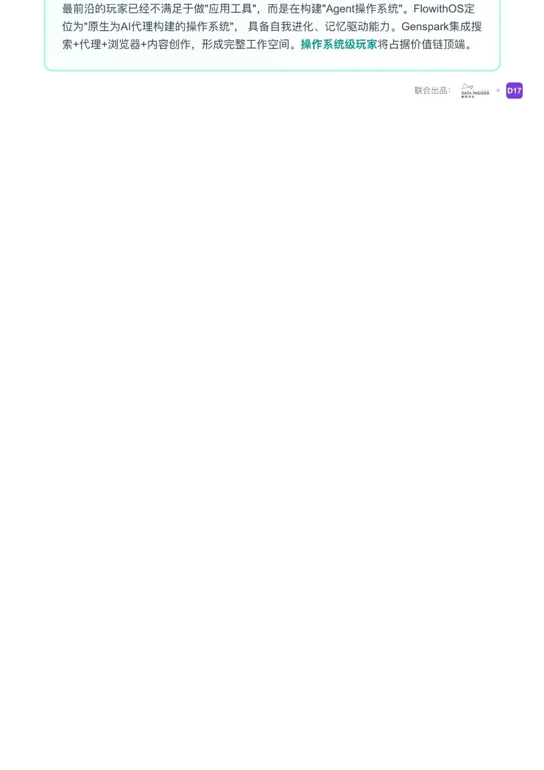 报告将通用型 Agent 市场划分为四大类别:对话式通用助手(如 ChatGPT、Claude)、工作流自动化平台(如 Gumloop)、任务执行型智能体(如 Manus、Genspark)、多智能体协作平台(如 Flowith)。这些产品各有特点,例如 ChatGPT 作为市场主导者,具备强大的通用性;Claude 以深度推理和代码开发能力获得高粘性用户;Manus 和 Genspark 能够自主规划任务并执行复杂目标;Flowith 则推出类似操作系统的 Agent,具备自我进化、记忆驱动等能力。