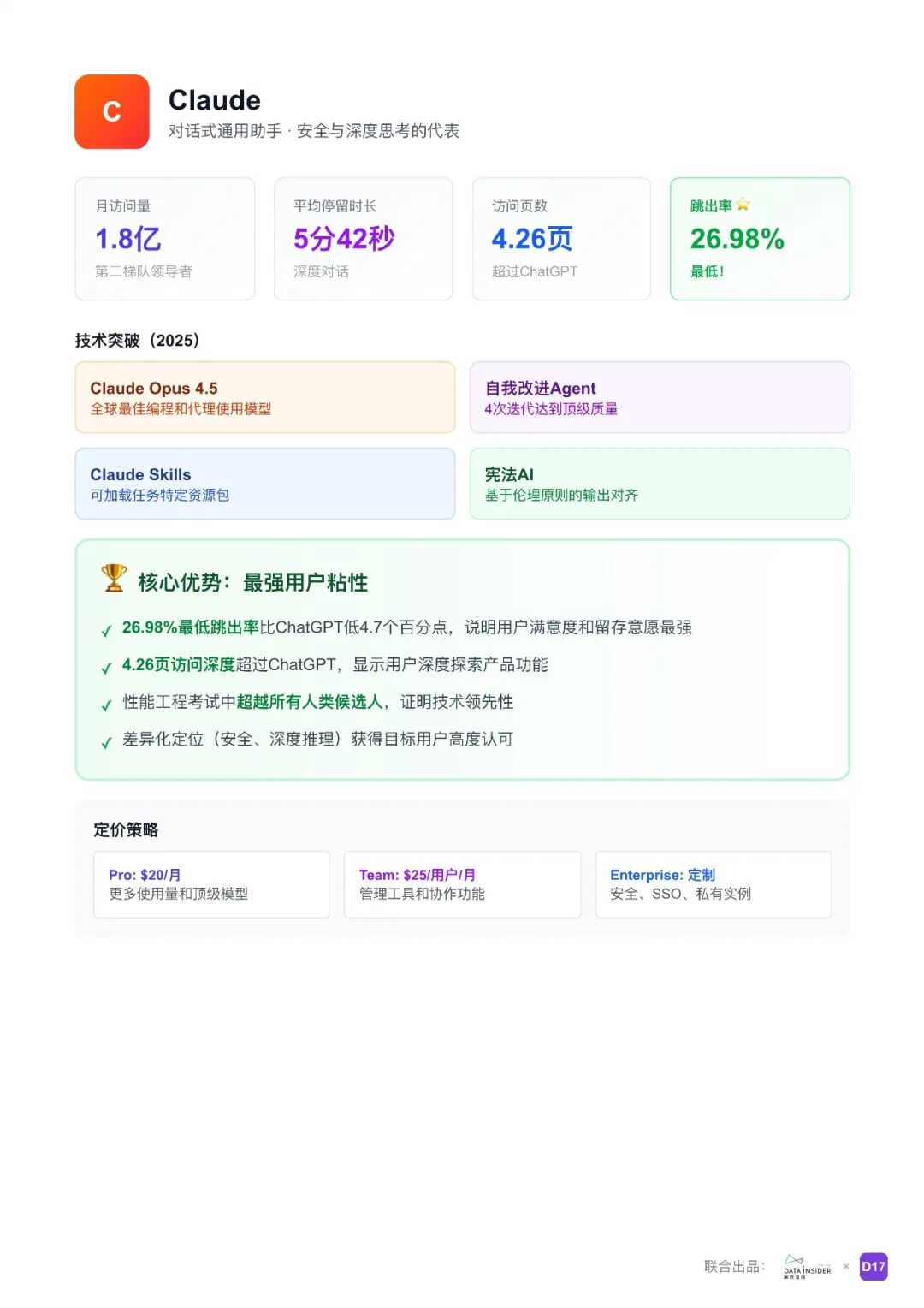 报告指出,通用型 AI Agent 正在重塑数字化工作方式,从简单的对话助手向能够自主规划、执行任务的智能体转变。ChatGPT 以 58.4 亿月访问量主导市场,但 Claude 凭借 26.98% 的最低跳出率展现出最强用户粘性,市场格局呈现明显的分层。报告总结了四大核心趋势:从对话到行动,Agent 能力实现本质跃迁,能够自主完成任务闭环;从单一到生态,多模型编排成为标配,集成能力成为核心竞争力;从通用到专精,市场分化为“广度通用”和“场景专精”两大方向;从工具到操作系统,Agent 基础设施诞生,操作系统级玩家将占据价值链顶端。