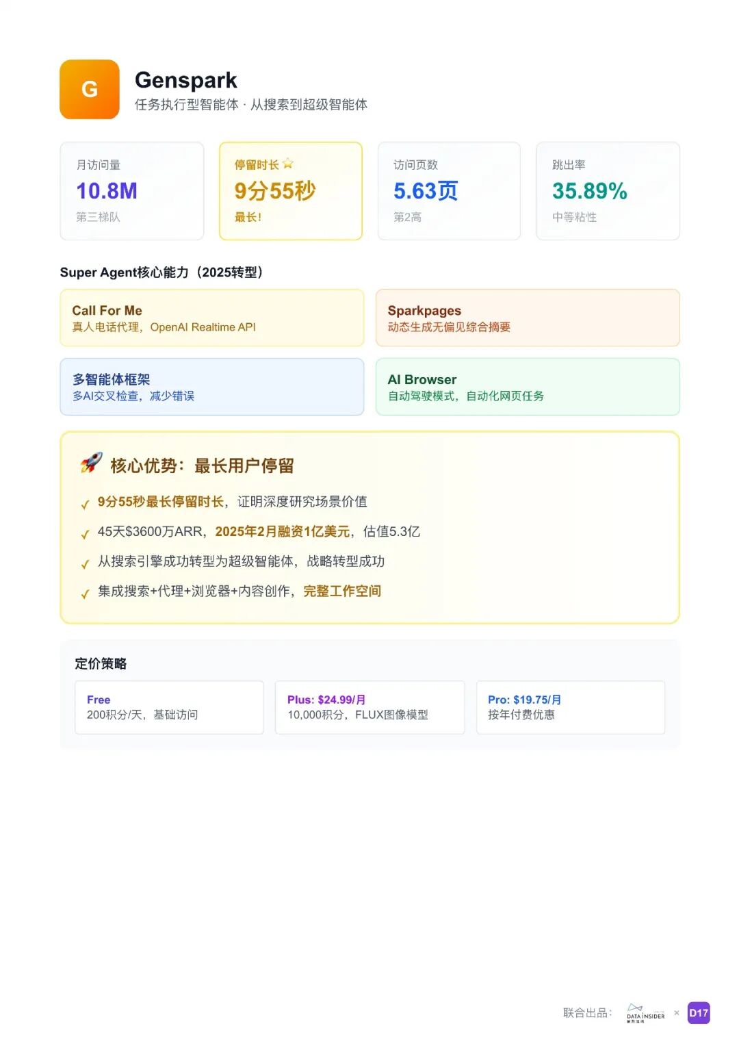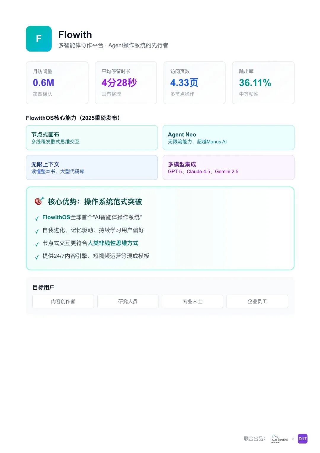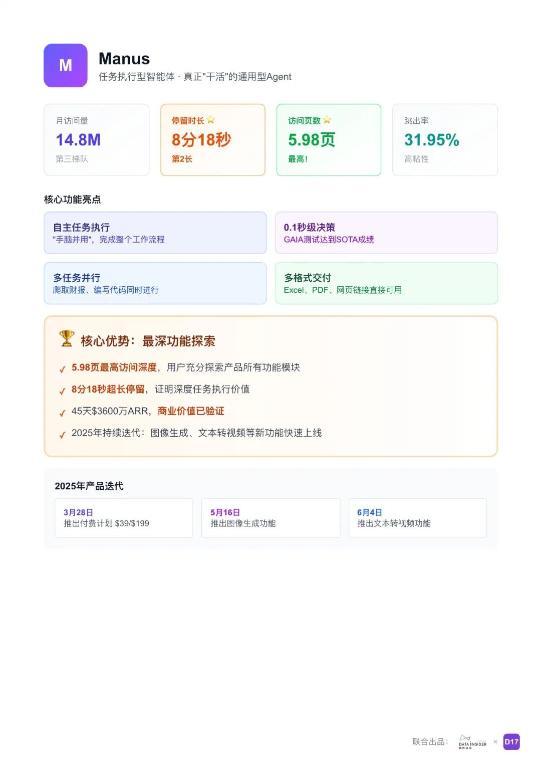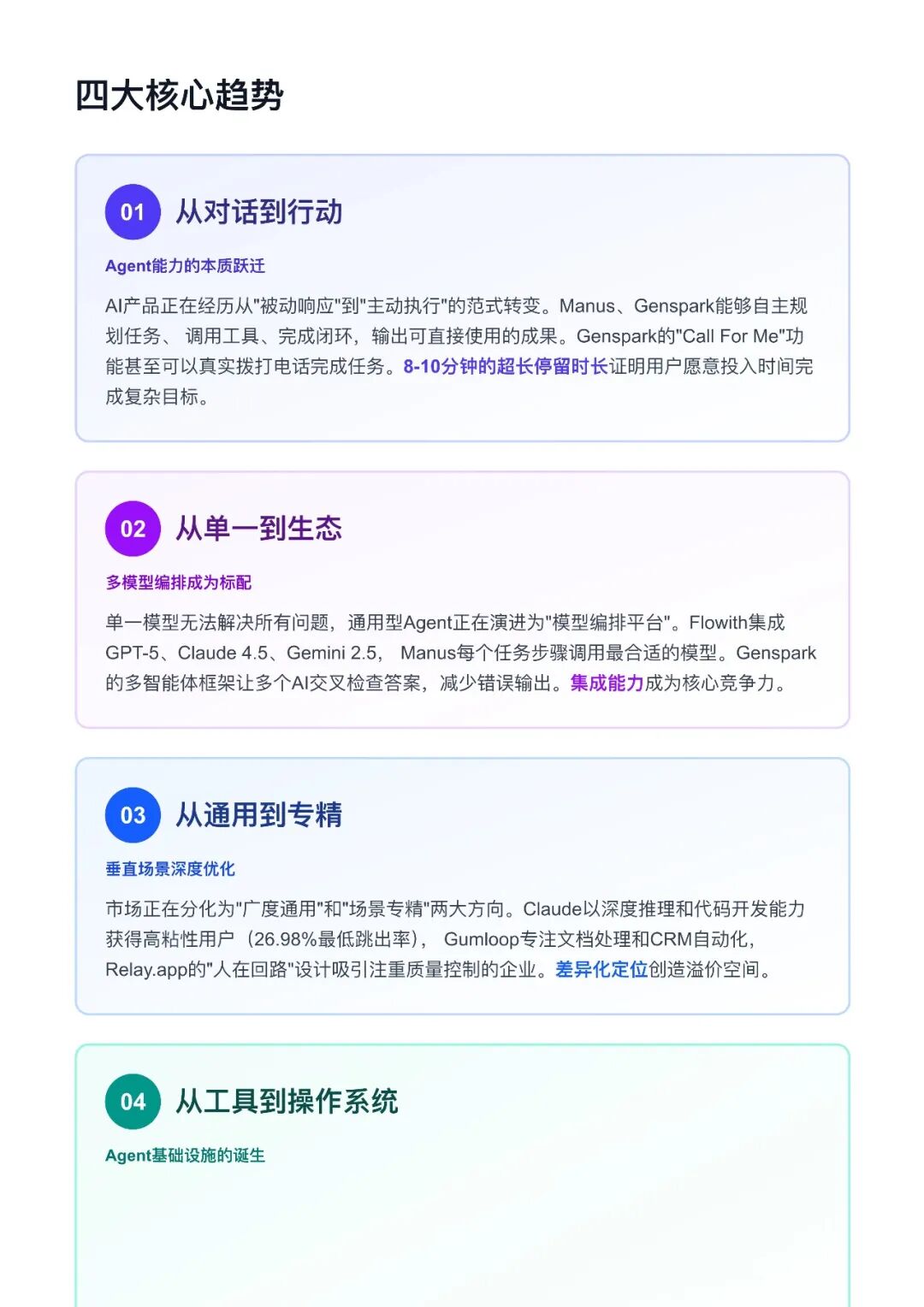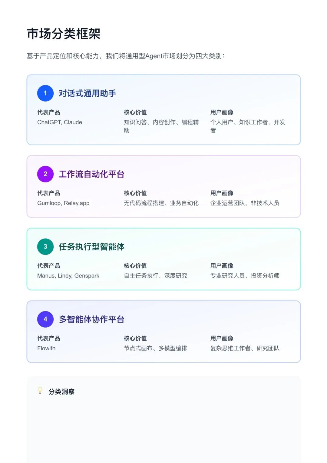 报告将通用型 Agent 市场划分为四大类别:对话式通用助手(如 ChatGPT、Claude)、工作流自动化平台(如 Gumloop)、任务执行型智能体(如 Manus、Genspark)、多智能体协作平台(如 Flowith)。这些产品各有特点,例如 ChatGPT 作为市场主导者,具备强大的通用性;Claude 以深度推理和代码开发能力获得高粘性用户;Manus 和 Genspark 能够自主规划任务并执行复杂目标;Flowith 则推出类似操作系统的 Agent,具备自我进化、记忆驱动等能力。