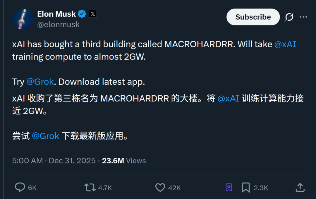 而且这还没完,马斯克后面还搞了一个“巨硬计划”,去年底还为其专门买了代号“MACROHARDRR”的专属厂房,当时马斯克就扬言其供电规模将达到2GW。