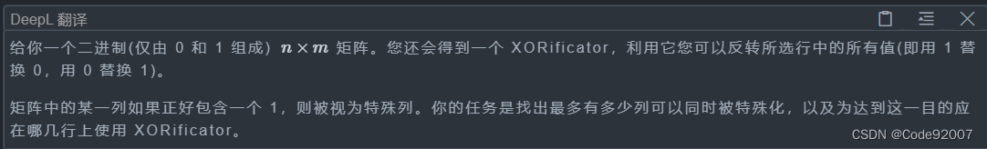 你可以选一行把所有01翻转,问最多可以让多少列只有一个1,然后把你翻转的行输出