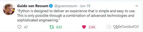 你就会看到一首名为Python之禅的诗,英文有些难懂,但是随着编程经验的增加你会慢慢理解Python的设计理念,例如 “Simplicity is better than Complexity”(简单比复杂更好), “Readability Counts“(可读性非常重要)。龟叔今年6月发过一条推特:”Python为了更简单和易用的体验而设计。这种简单易用是通过先进技术和复杂工程实现的。”所以Python外在的简单是一种内部复杂的呈现。