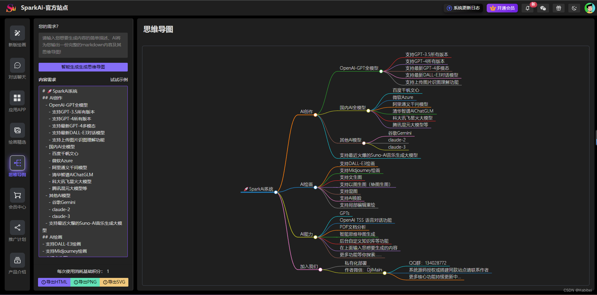 SparkAi创作系统是基于ChatGPT进行开发的Ai智能问答系统和Midjourney绘画系统,支持OpenAI-GPT全模型+国内AI全模型。支持GPT-4o大模型、文档分析、识图图片理解、GPTs应用、GPT语音对话、联网提问、GPT-4全模型、DALL-E3文生图、GPT4-All联网搜索模型、思维导图、会员套餐功能、分销系统、Midjourney绘画动态全功能、AI换脸、垫图混图、插件功能等等!支持最近火爆的Suno-AI音乐生成大模型