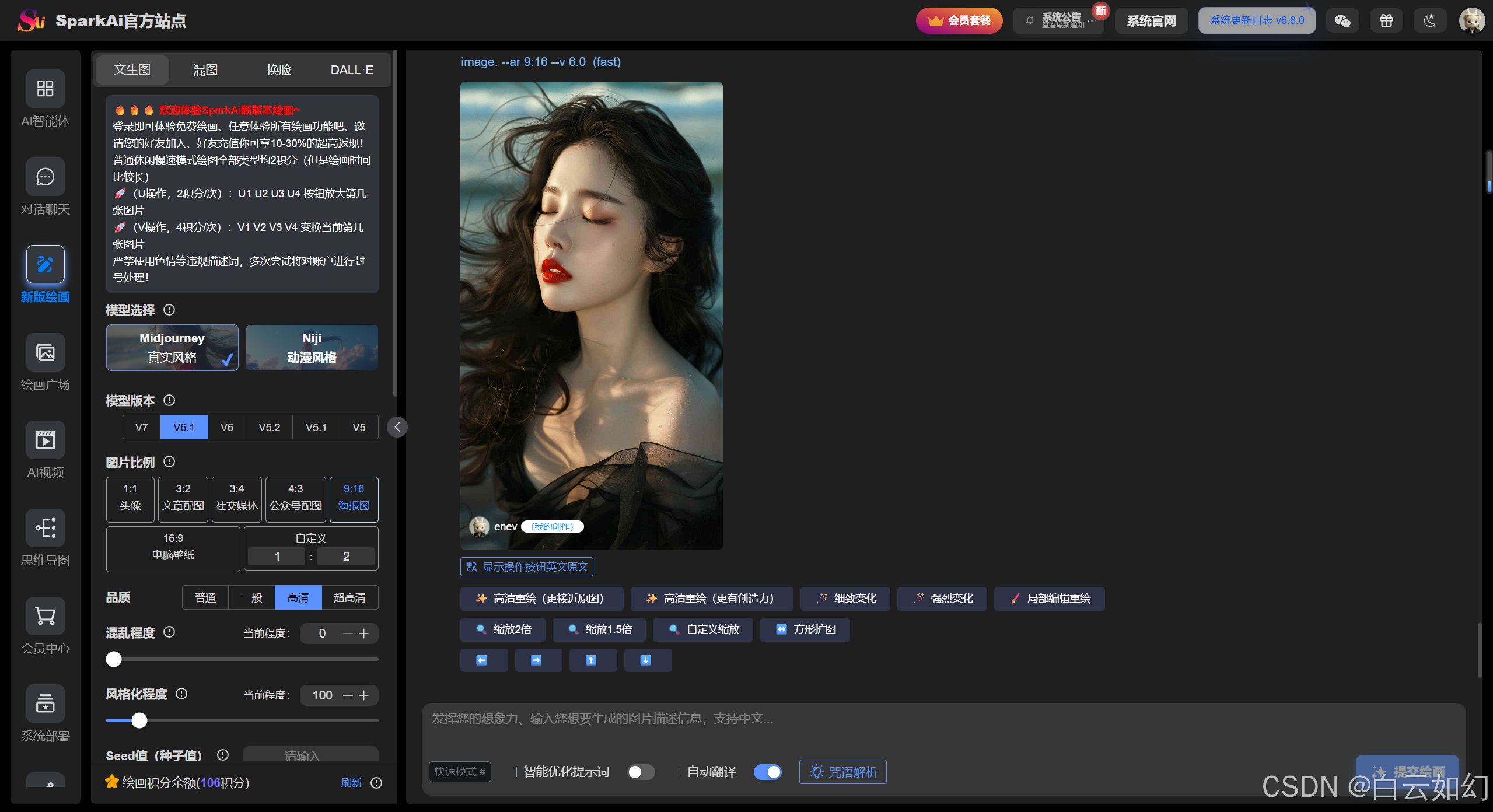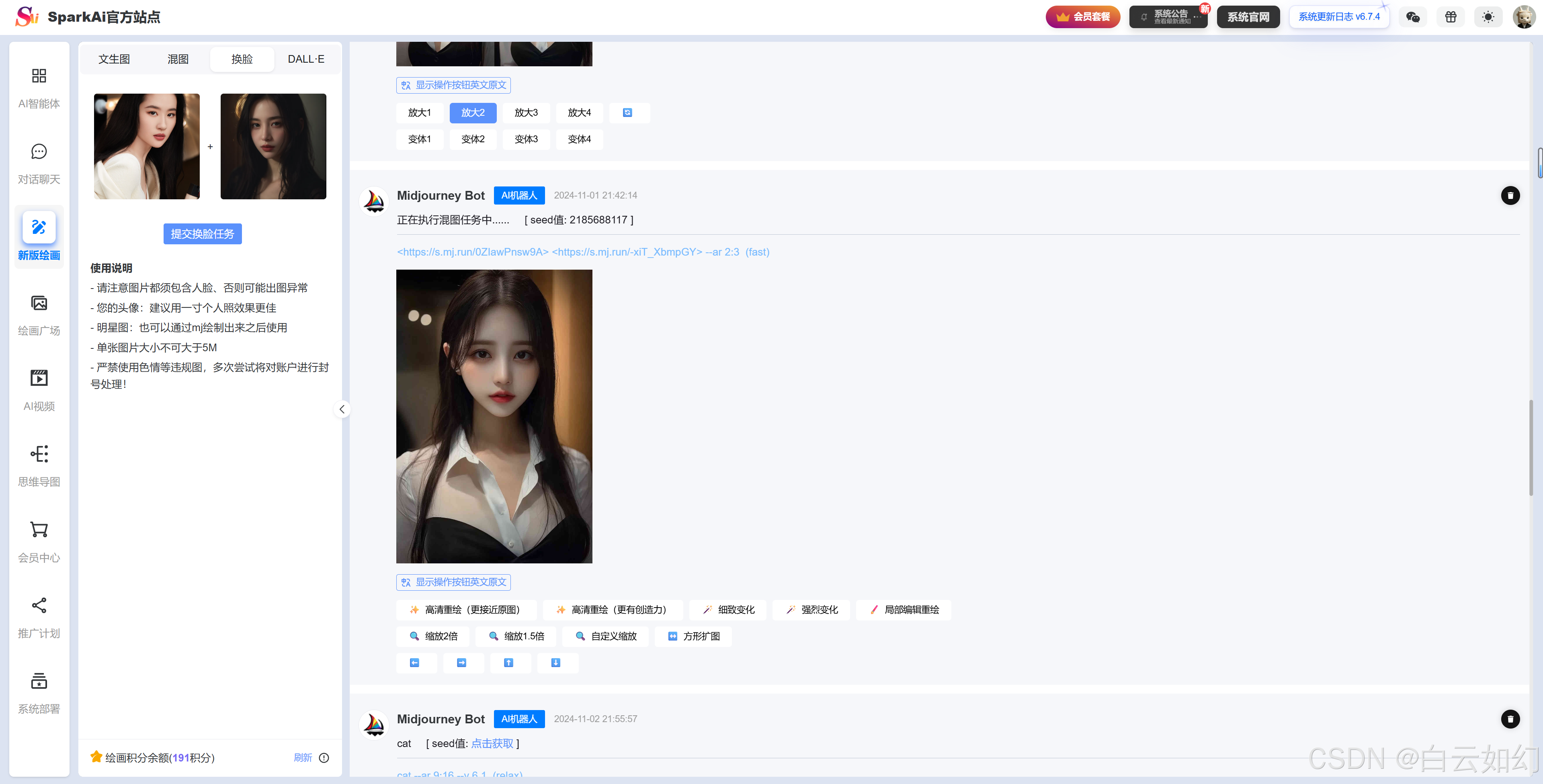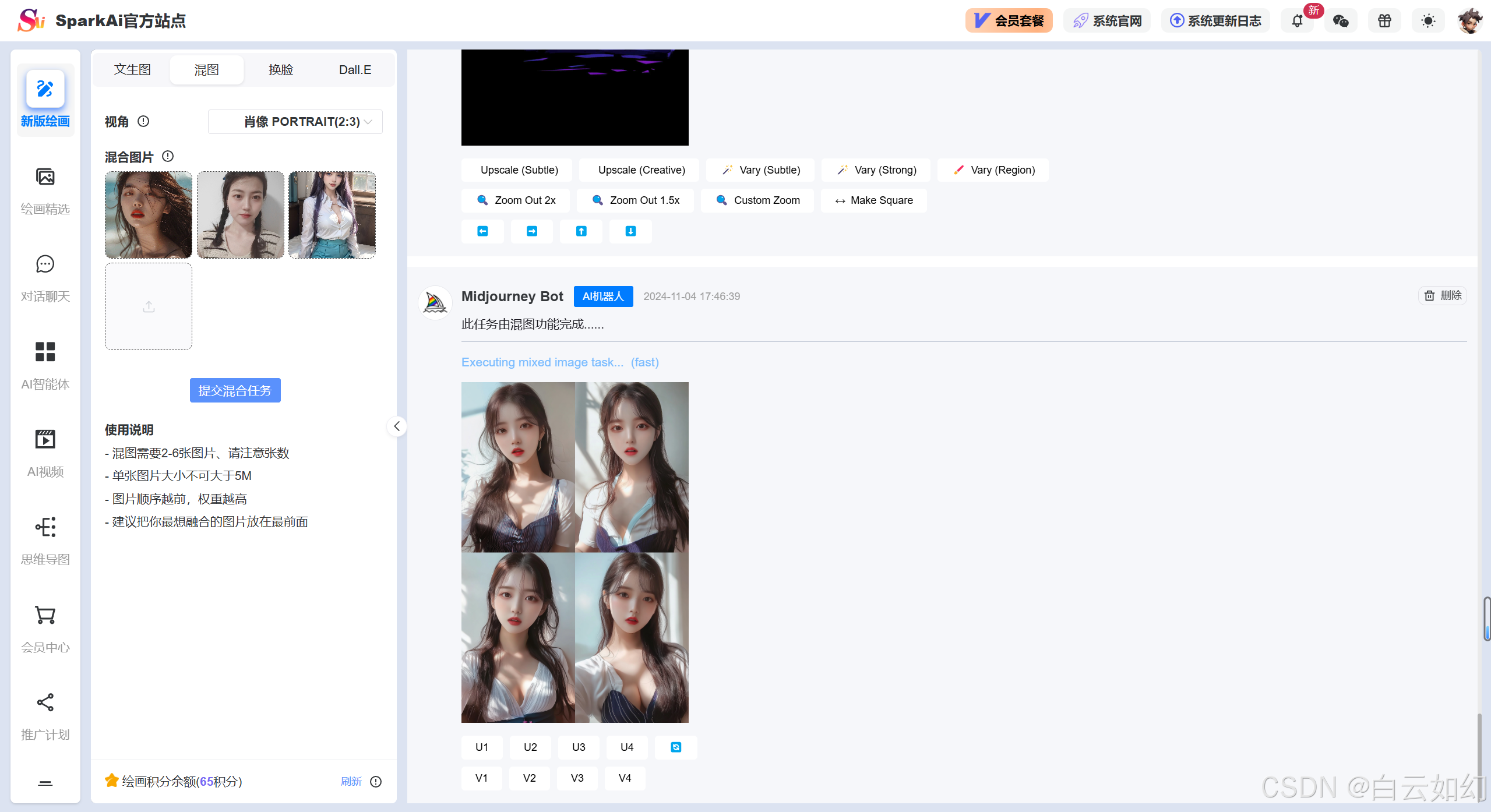 专业绘画系统:文生图、图生图、垫图混图、角色一致参考图、风格一致参考图生成等、AI换脸、混合图片生图。