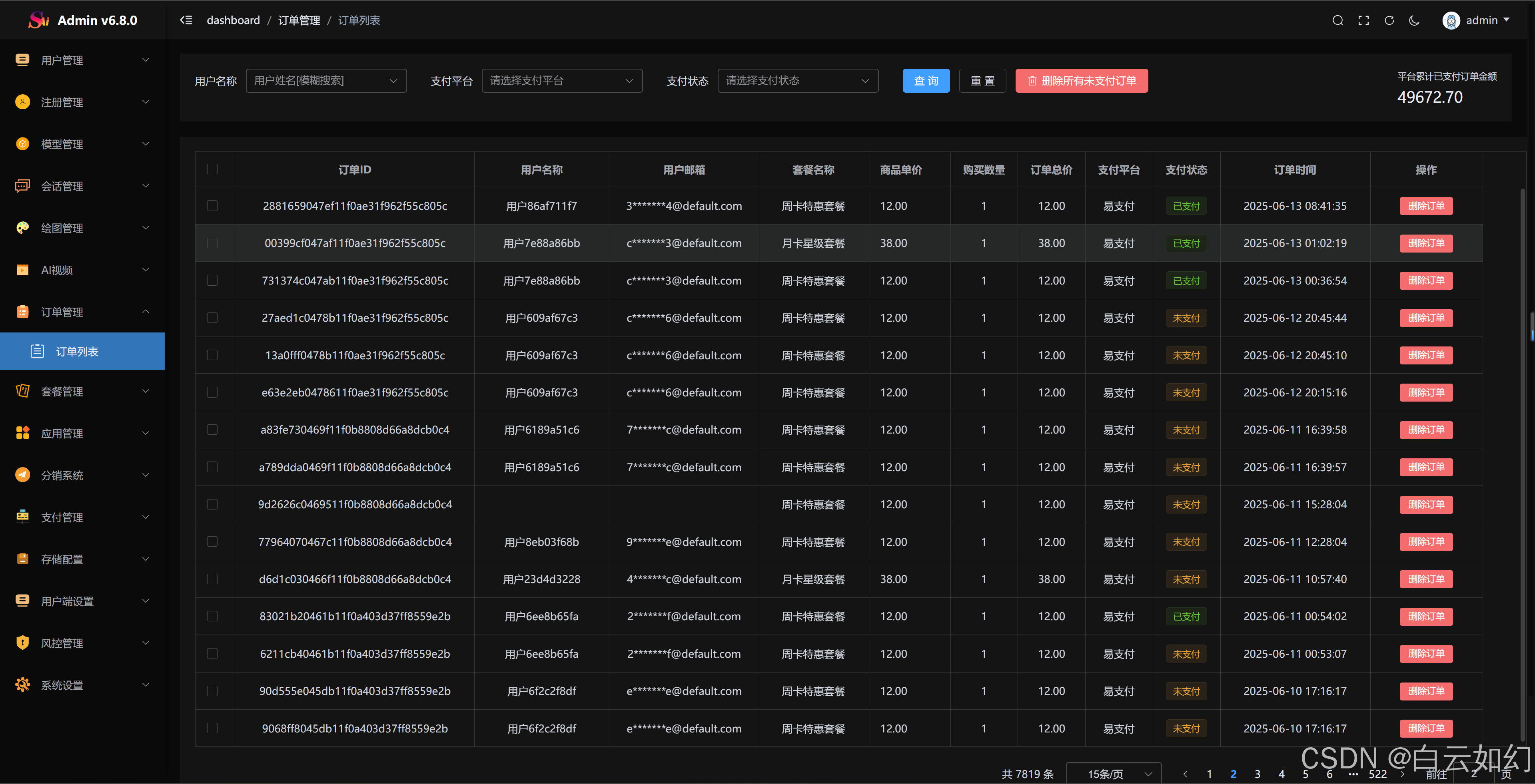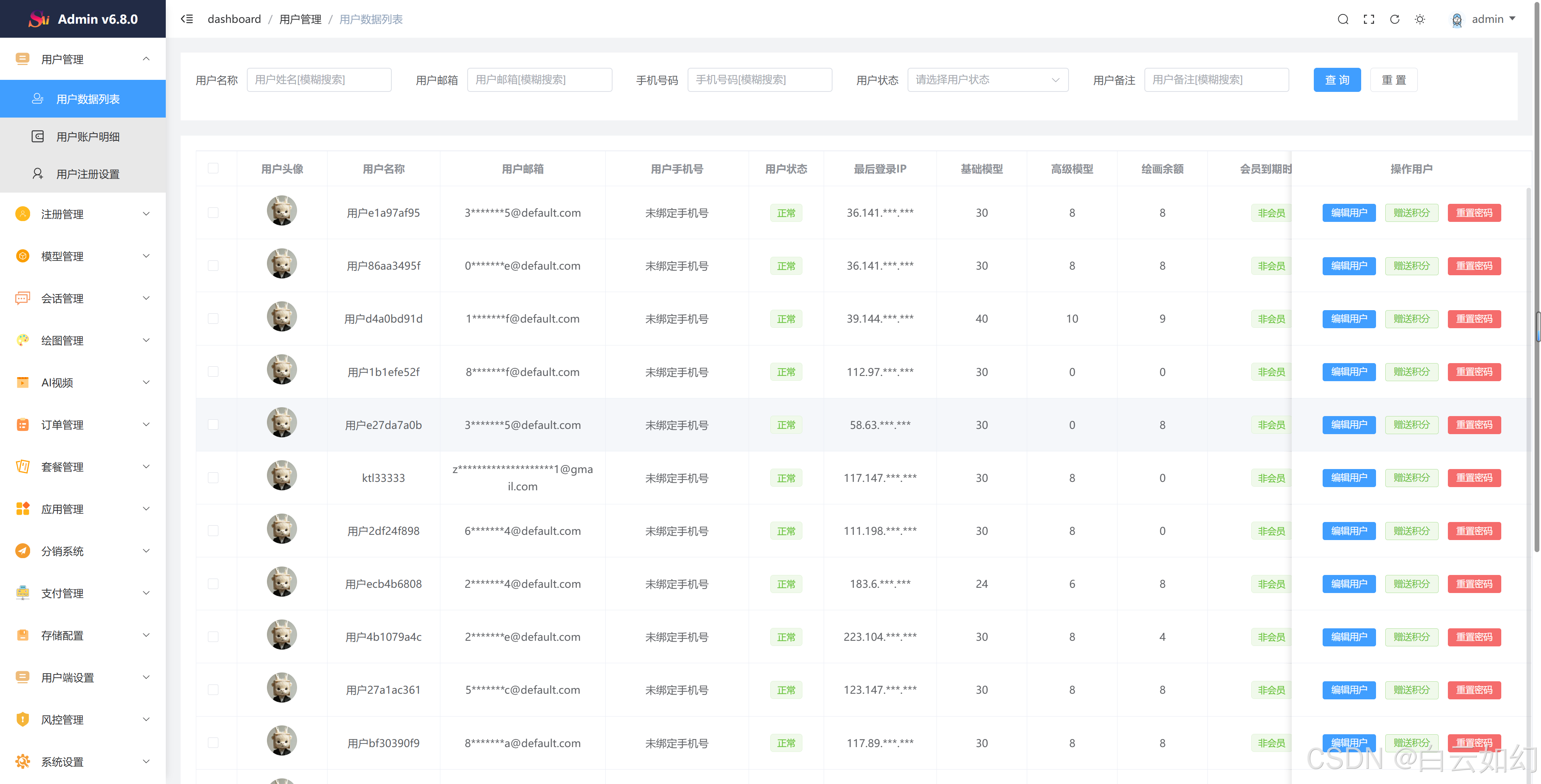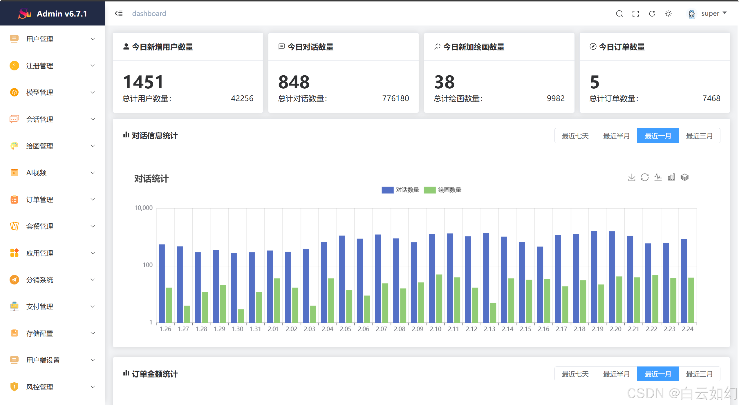 数据统计:丰富美观的仪表盘统计,支持每日新增用户数量统计 / 总计和每日对话数量 / 总计和每日新加绘画数量 / 总计和每日日订单数量统计 / 等多种信息统计图表趋势展示。