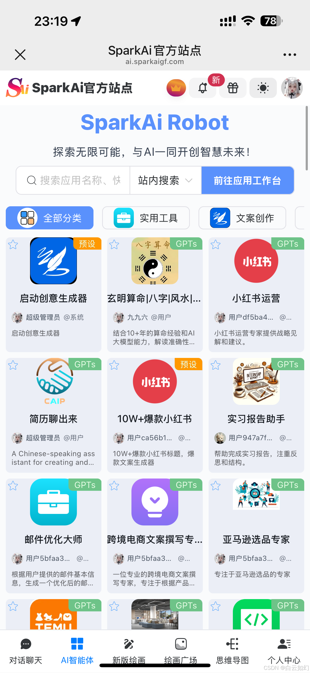 coze工作流智能体(需自行转成chat格式)、FastGPT知识库应用(可官方api直接对接)、FastGPT工作流应用(可官方api直接对接)):请求对话接口兼容chat接口,支持对接OpenAPI 对话接口的知识库或工作流应用,其他平台API可通过one api等中转系统将其转成chat标准格式,对接api,以模型展示方式或绑定模型到智能体进行使用,即可将其他平台API知识库或工作流应用对接到本系统!AI智能体系统:GPTs应用+Prompt自定义预设应用;支持OpenAI官方商店全部GPTs应用接入。GPTS-支持GPTS后台自定义添加、也可以全站搜索 = 官方搜索。