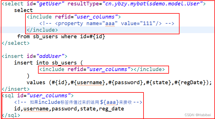 ②sql和include:这两个标签是配合一起使用的,作用就是将一些重复的slq片段,像提公因式样,单独抽出来可以重复调用。